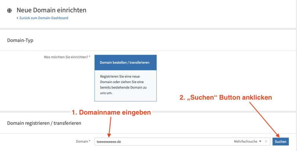 4. Geben Sie nun Ihre gewünschte, zu registrierende, Domain imm Suchfeld ein und klicken dann auf „Suchen“