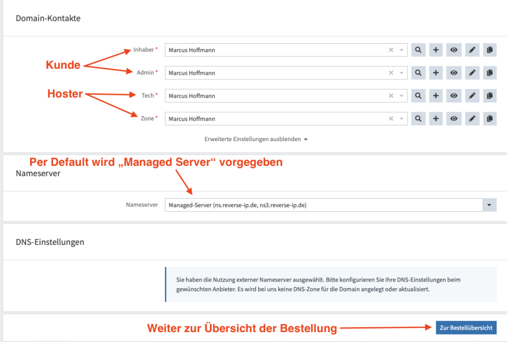6. Legen Sie nun den Domaininhaber (im Regelfall der Kunde) und den technischen Administrator (im Regelfall Sie als Hoster) fest. Per Default sind Sie bereits vorausgewählt.