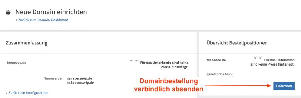 7. Sie sehen nun nochmal eine Übersicht Ihrer zu bestellenden Domains und die ausgewählten DNS Server. Wenn alles korrekt ist und Sie die Bestellung verbindlich absenden möchten, dann klicken Sie auf den Button „Einrichten“.