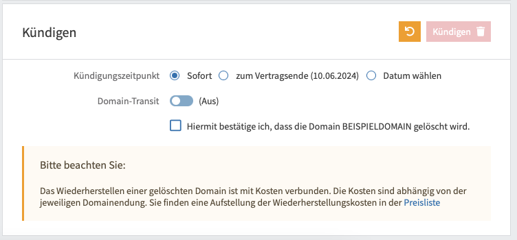 - Kündigungszeitpunkt: Geben Sie an zu wann die Domain gekündigt werden soll.