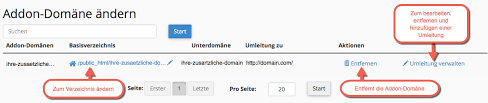 Selbstverständlich können Sie eine bestehende Addon-Domäne auch jederzeit nachträglich wieder bearbeiten, wie z.B. das Verzeichnis ändern oder eine Weiterleitung hinzufügen: